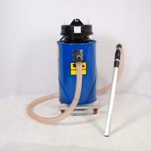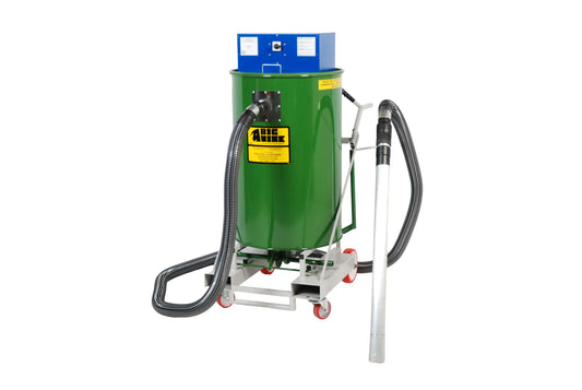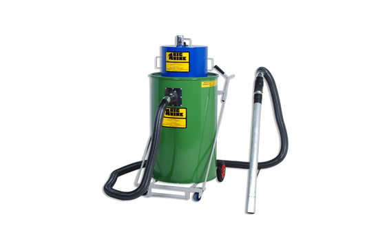 The collection drum must be steel (plastic drums or tubs will collapse under the vacuum pressure) and can be 10 gallon to 95 gallon capacity. The top rim of the drum MUST be in good condition and capable of holding vacuum pressure.